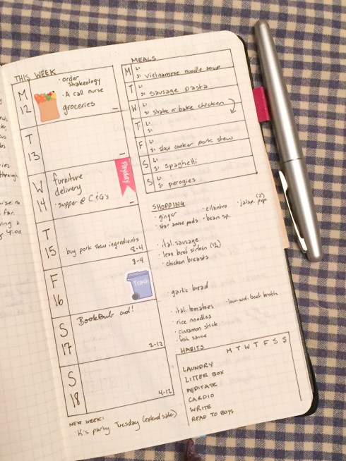 What else goes on a typical daily page? Decorations. I might draw a Pokémon I caught with the kids, or a fancy cupcake if we’re celebrating a birthday. I keep a health tracker on every day’s page for the little routines I will absolutely forget if I’m not checking them off (stretching out my back, taking medications and vitamins, etc.). If I’m doing an instagram challenge or really need to share something on social media, I’ll add that. Things to pick up if I go by the store. Errands. Notations of bills I need to pay that day and the confirmation number for the transaction. Chores. Work tasks and goals. On a really busy day I might use some space to make a timed plan of when I need to be ready for things, because I have a horrible sense of how long it takes to get places and do things. If it’s on paper I’m less likely to assume I can spare another 5 minutes.