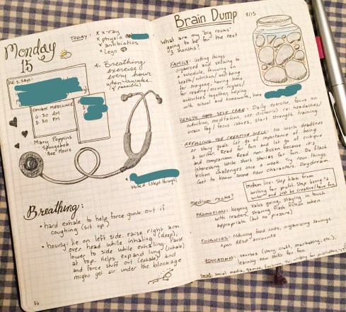 Sometimes my daily pages are a full page (usually), sometimes just half. Sometimes they have fancy headers and doodles, sometimes they’re basic lists. It changes to suit me, which is great (this one was while I was in the hospital with one of my kiddos this summer, doing some hard thinking about my stress levels and stalled productivity while he napped. And my journal accommodated that beautifully).