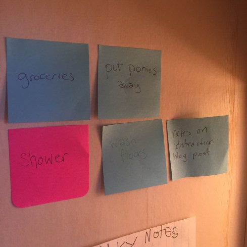 This is one I came up with myself, though I’m sure I’m not the first to do it. I keep a stack of post-it notes on my desk. When a distraction pops up (gotta check facebook, crap I forgot to change the filter in the Brita, I really need to get those last Christmas decorations put away, better call about that appointment I’ve been putting off…), I write it on a post-it and stick it to the wall. Right where I can see it. Does that sound weird? It works for me. See, if I just write it down and put it aside, it will keep bugging me because my brain is all WHAT IF WE FORGET?!! But if it’s visible, it’s acknowledged. It’s a thing I’m saying I will get to, and it loses some of its power as a distraction. Then, after my word sprint is done, I’ll pick one quick thing and do it. Kind of a reward (though social media is a dangerous one).