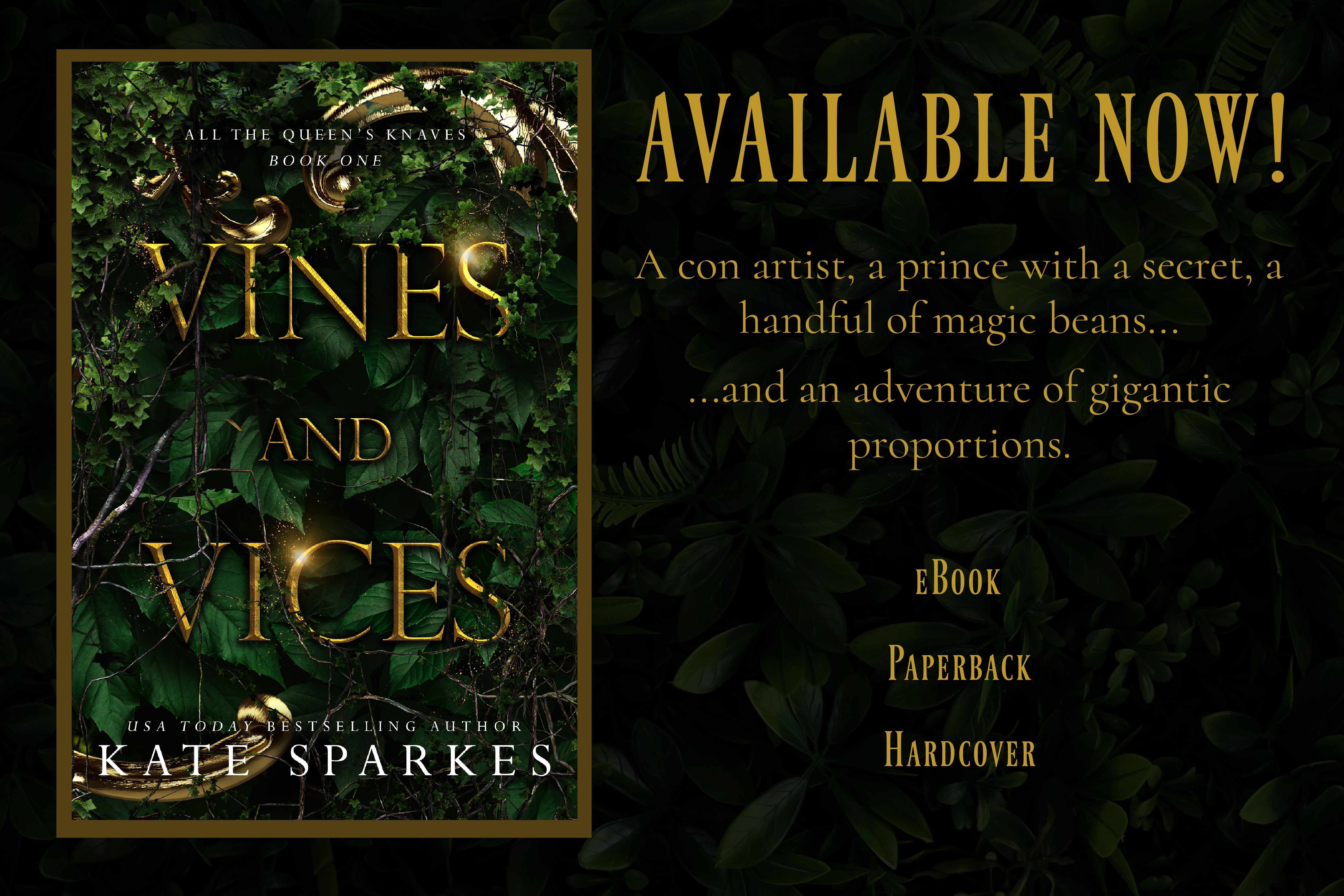 Vines and Vices (All the Queen’s Knaves book one) is available now through most ebook retailers, in paperback and gorgeous hardcover, and by request through libraries.