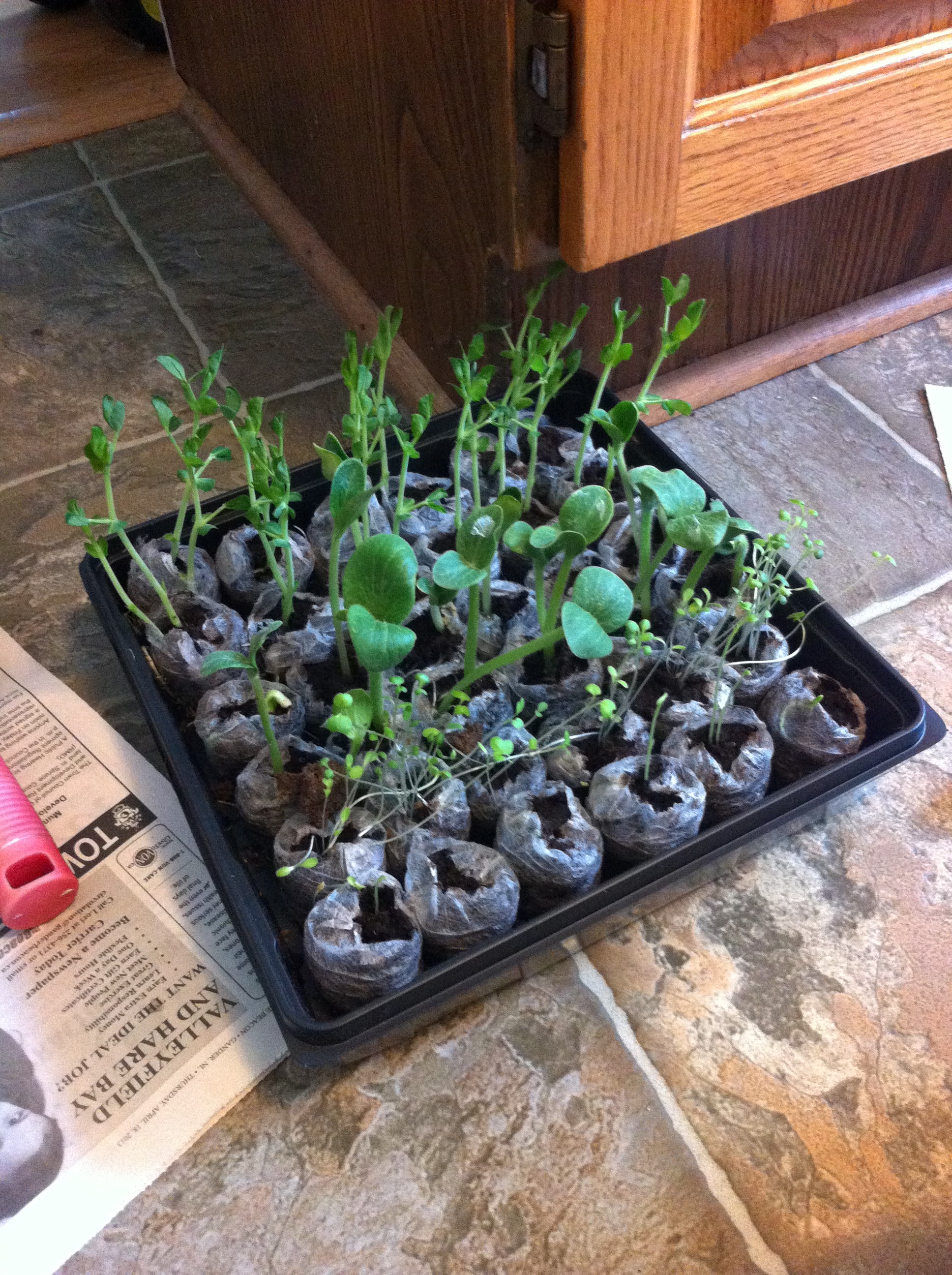 So there we were with our tiny jungle of seedlings that we’d started as instructed: 2 or 3 seeds in each pellet. Oh, the bounty!