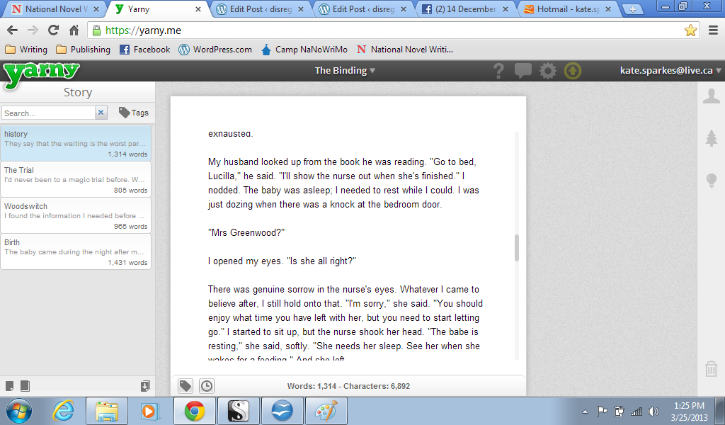 So what does this all mean? For me, there are advantages and disadvantages to both programs. Generally, I prefer Scrivener. It has more weight to it, I’ve used it successfully in the past, I like the bells and whistles, and it’s never lost 2 hours’ work (well, not since beta testing updates). But if it’s not working for me right now, I’ll give Yarny a shot.