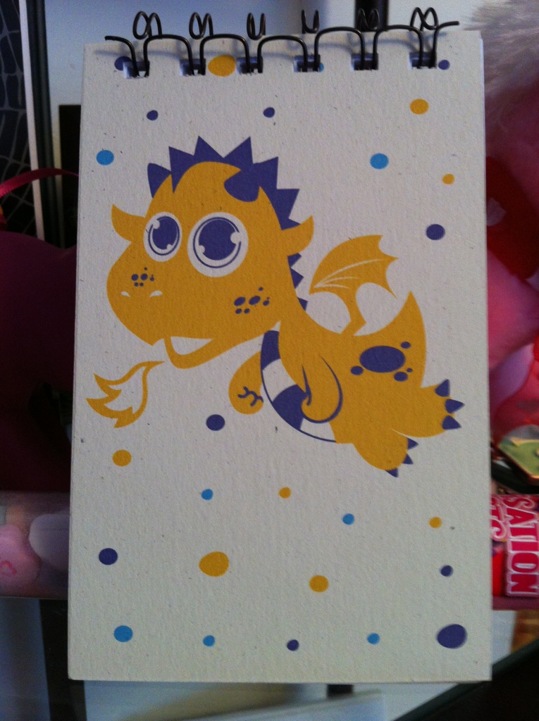 …I don’t know what that one’s for yet. It’s my new favourite notebook (and has unlined paper, wheeee!), which means that I refuse to mark it up with notes or drawings. We’ll have to wait and see; I just wanted to show it off. LOOK HOW ADORABLE THAT DRAGON IS!